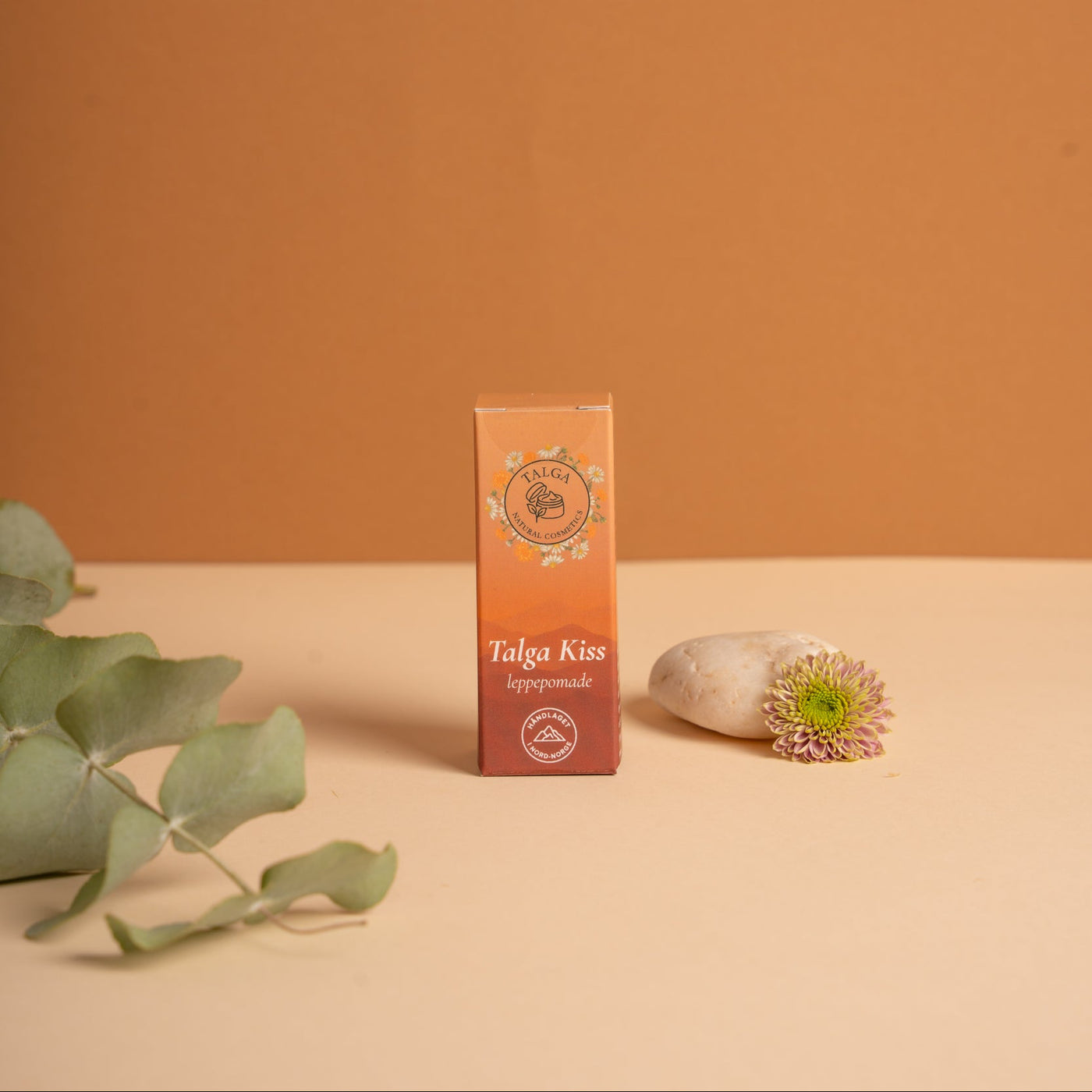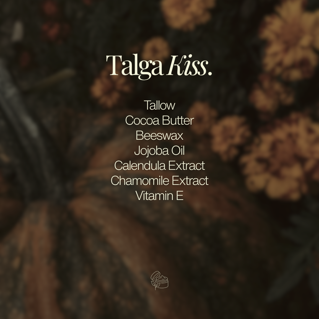 Talga Kiss er en ren og nærende leppepomade laget for å beskytte og pleie leppene året rundt. Basert på tallow (storfetalg), kakaosmør og bivoks gir den en silkemyk konsistens som smelter inn uten å føles klissete. Jojobaolje tilfører fuktighet, mens ekstrakter av ringblomst og kamille virker beroligende og reparerende. Vitamin E beskytter mot frie radikaler og hjelper leppene å holde seg myke og sunne.